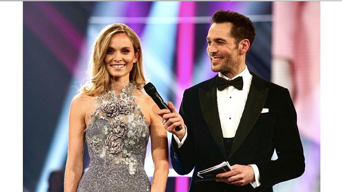 Die Hamburger Sängerin und Songschreiberin Jenny van Bree in Abendkleid von Flora S ,ein wunderschöner Entwurf von Flora S, ein Abendkleid mit einem tiefen Dekolleté mit Goldpailleten und Perlen verziert, im Meerjungfrauen Schnitt gehalten.