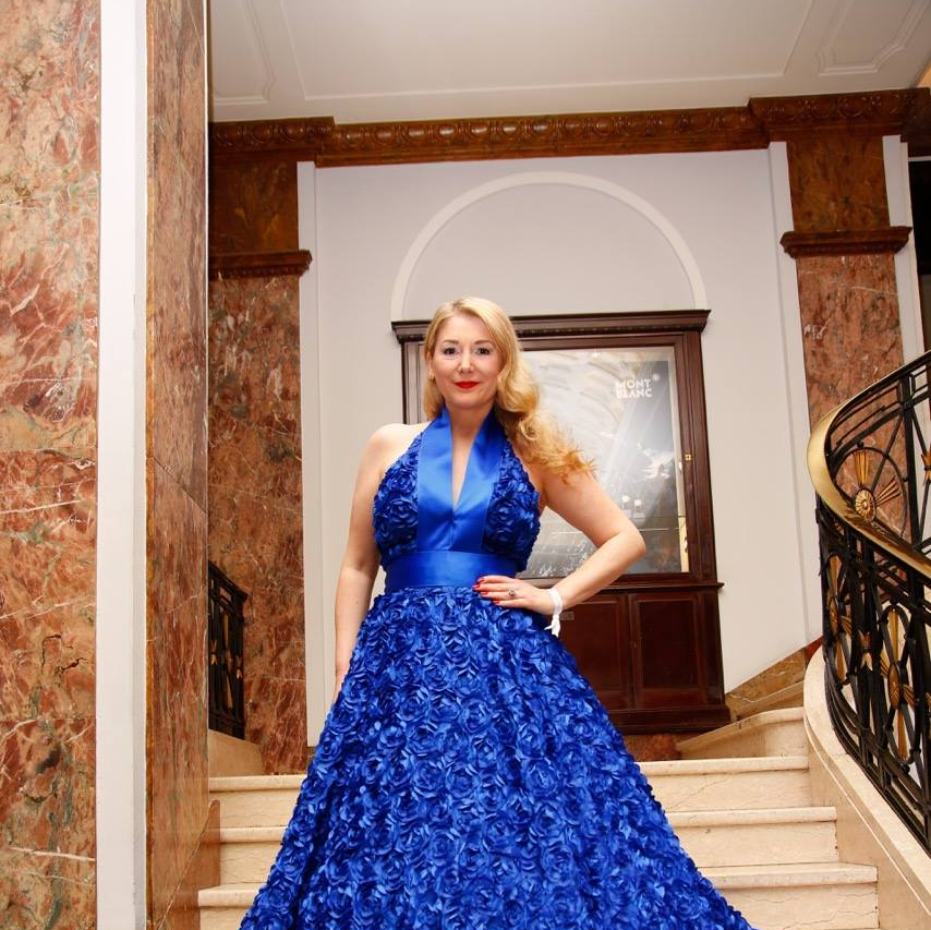 Schauspielerin Sandra Quadflieg in Ballkleid von Flora S,eine unvergessliche blaue Nacht in "Flora S" Mode, in den unvergesslichen blauen Räumen des Atlantic Kempinsky Hotels.Hamburg.